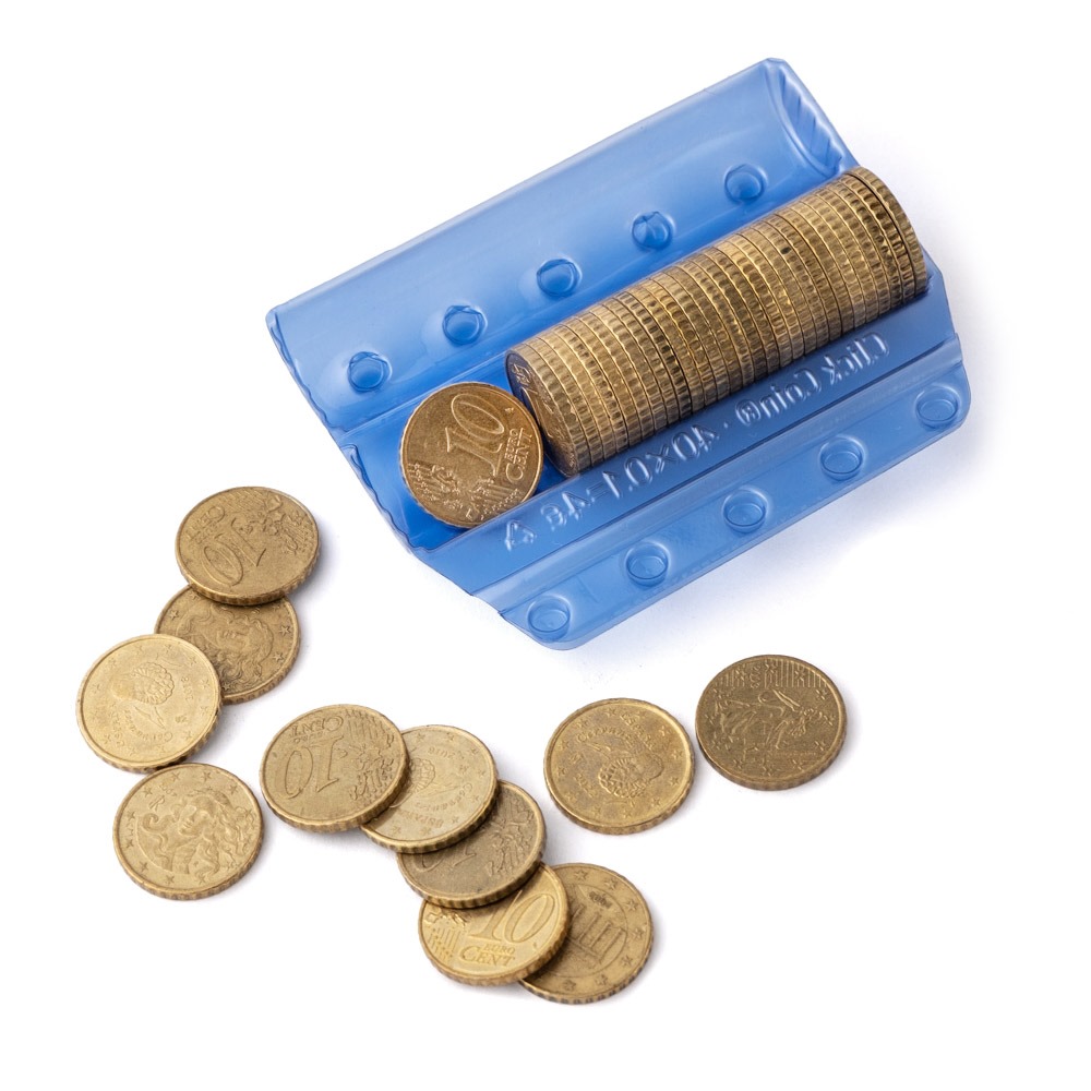 Práctico pack de 100 blísteres para monedas de 10 céntimos. Cierre duradero.